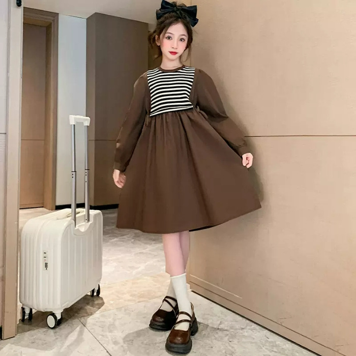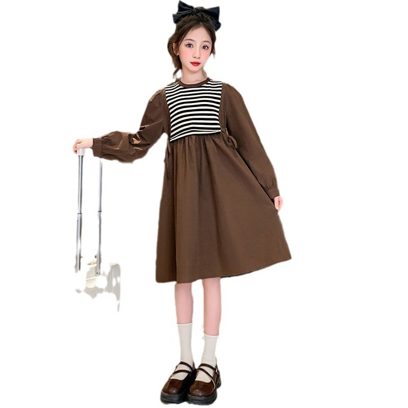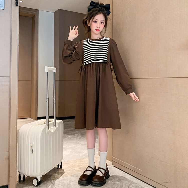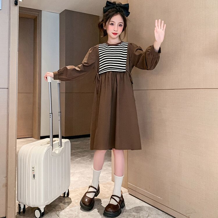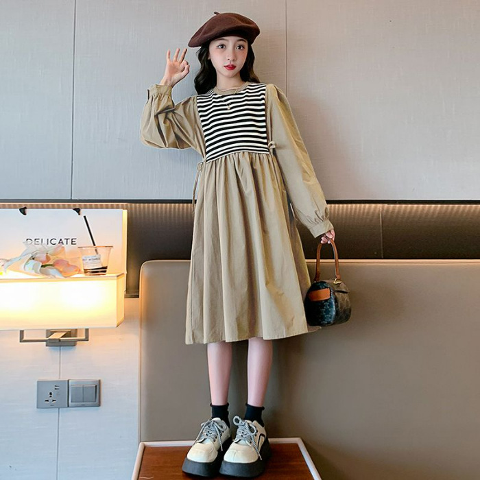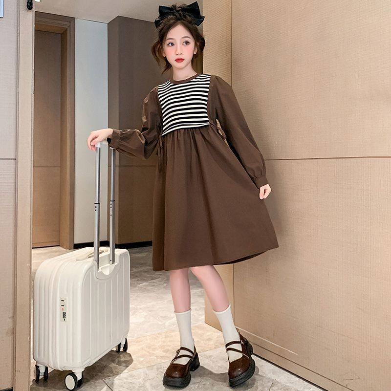 春秋新款女童韩版连衣裙中大童洋气时髦条纹拼接长袖公主裙潮