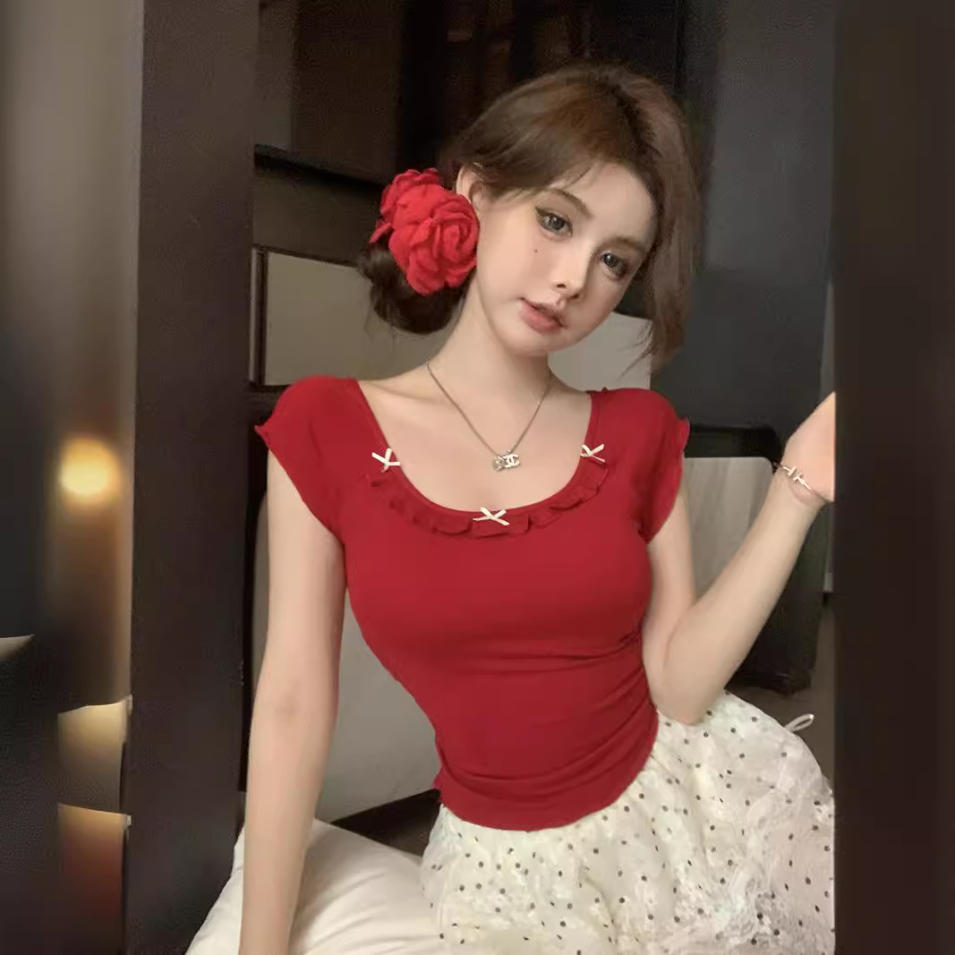 蝴蝶结木耳边u领短袖T恤女夏季新款纯欲辣妹褶皱修身短款红色上衣