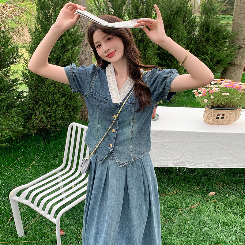 韩系穿搭牛仔套装裙女夏季新款泡泡袖v领上衣半身裙两件套
