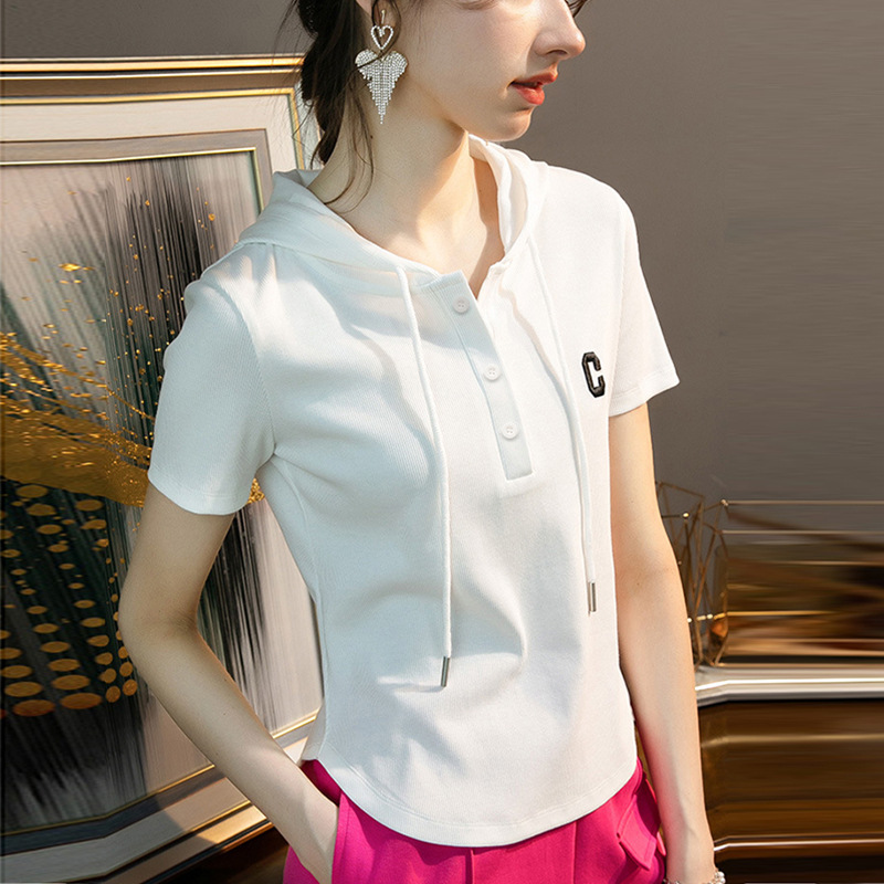 夏季新款弧形下摆打底衫短袖t恤女休闲连帽卫衣法式别致上衣