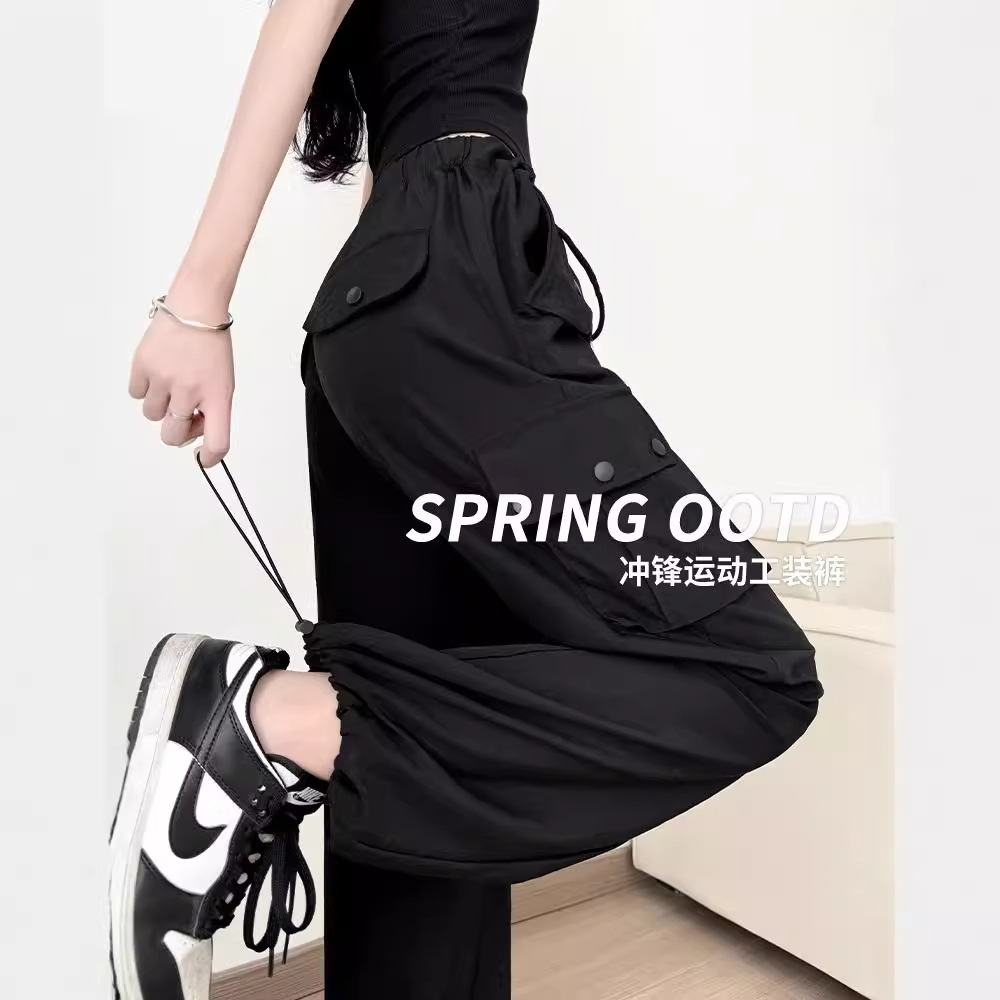 黑色美式工装裤女春秋季薄款高腰显瘦休闲裤小个子宽松束脚运动裤