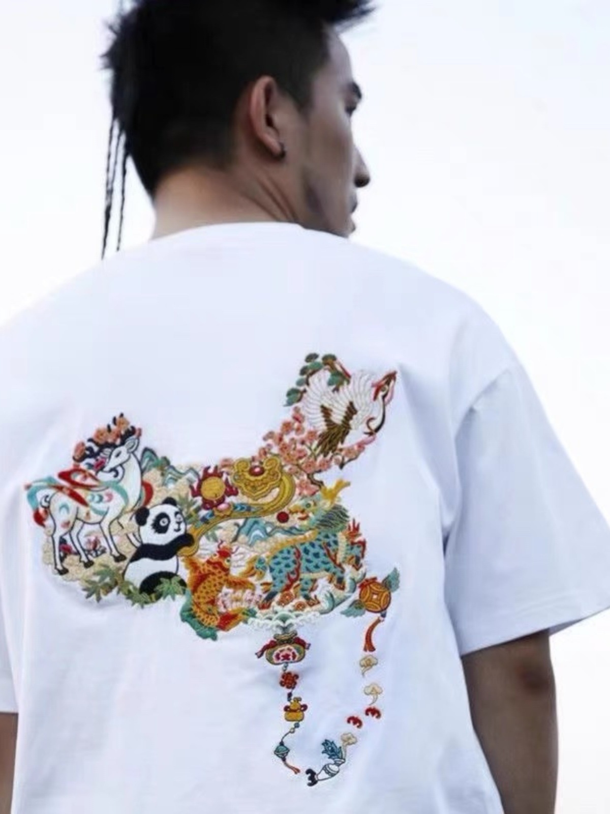 同款夏季短袖纯棉100%上衣国潮白色刺绣T恤男熊猫圆领体恤