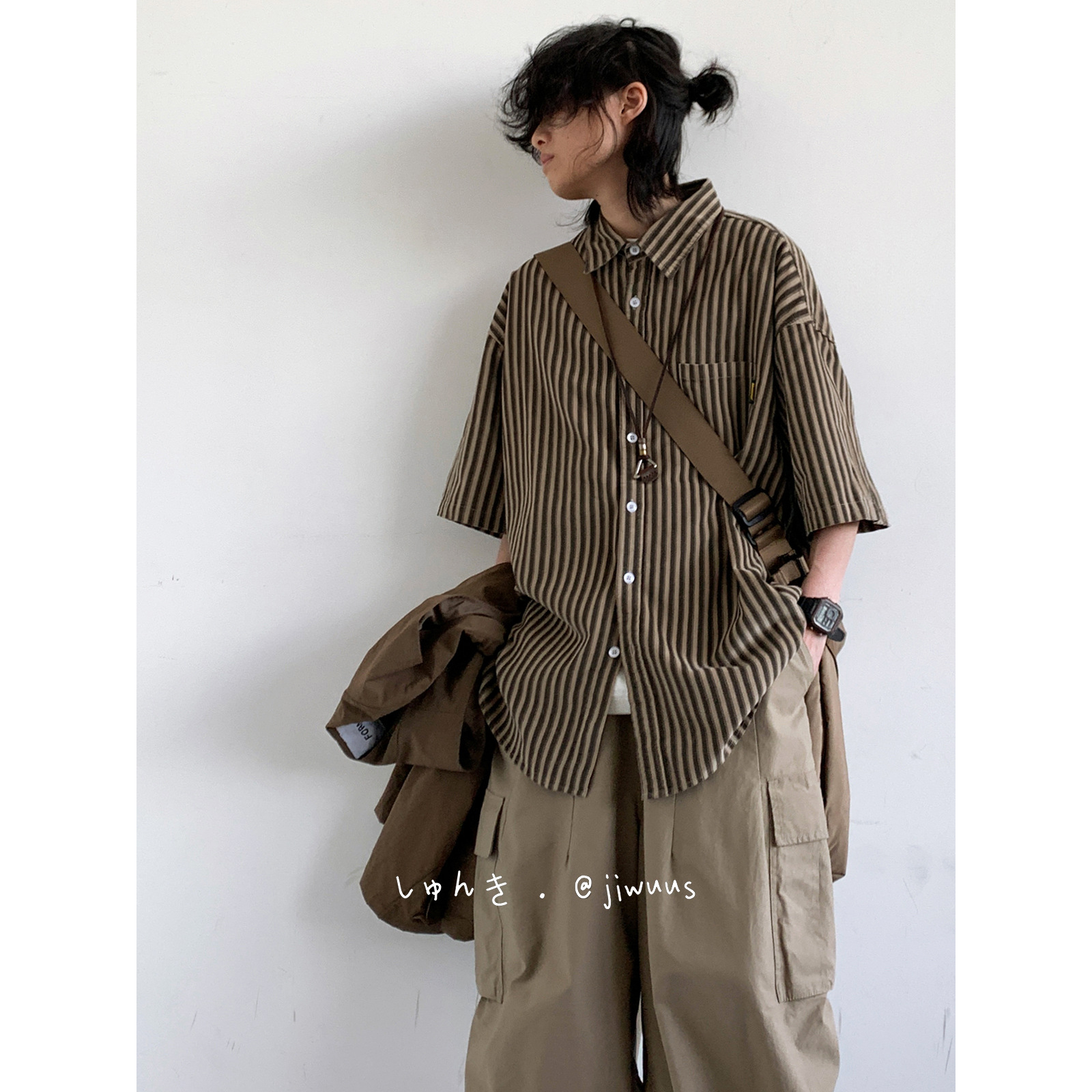 日系复古小众原宿风条纹短袖衬衫男生夏季新款宽松男友风工装衬衣