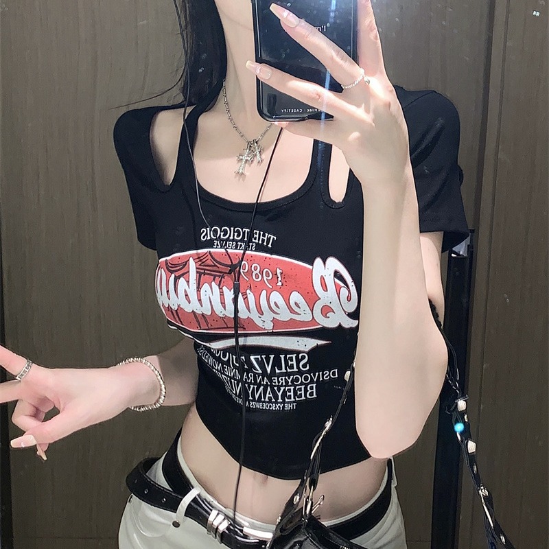 美式短款上衣女黑色正肩T恤女短袖夏季2025新款辣妹多巴胺短款