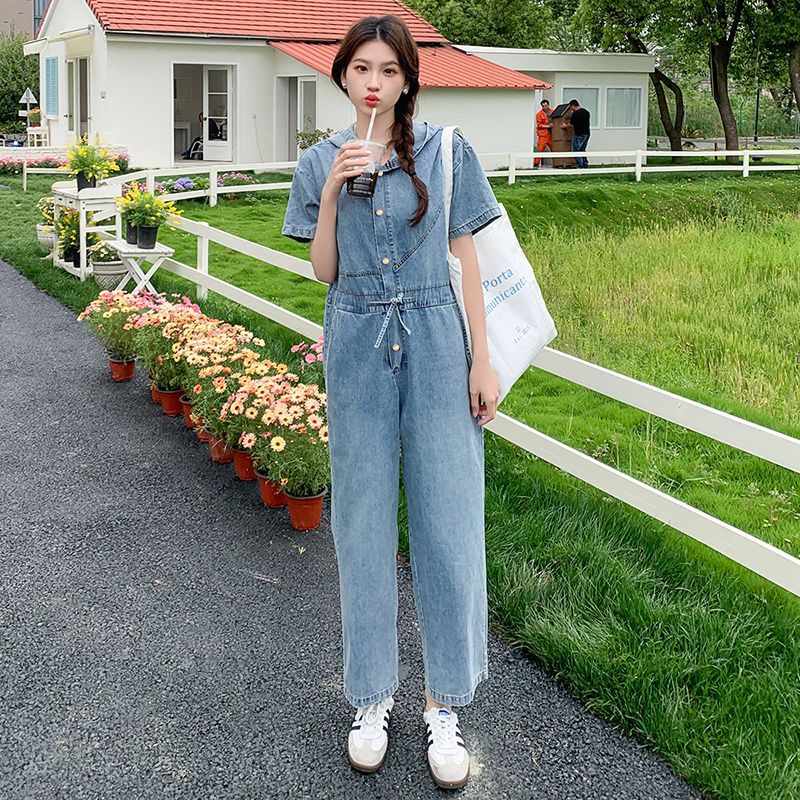 新款复古短袖款连帽牛仔连体裤女夏季休闲时髦炸街工装长裤子