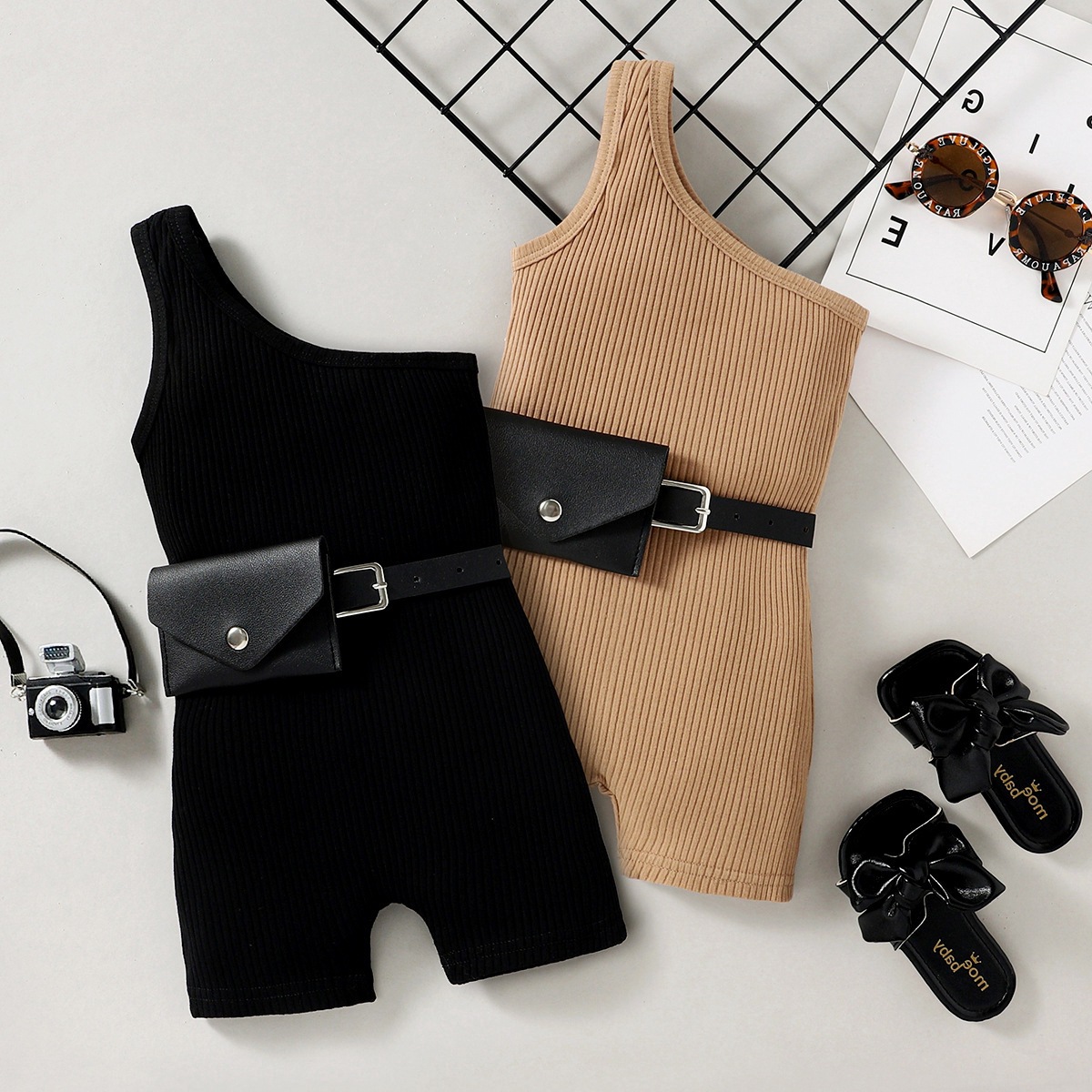 女童夏装连体衣宝宝洋气儿童个性潮韩版不规则露肩腰包网红连身衣