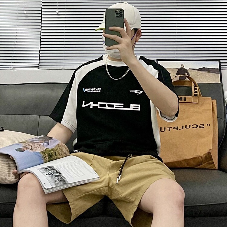 拼色印花短袖t恤男夏季运动落肩袖宽松潮牌体恤圆领半袖国潮上衣