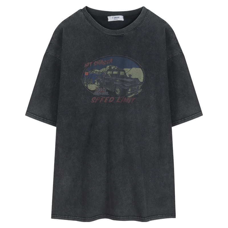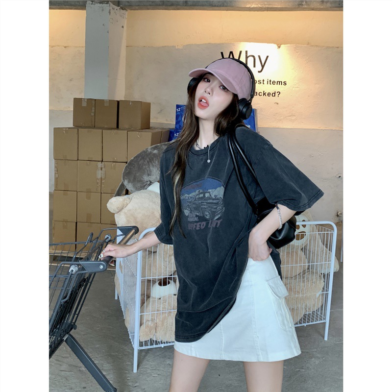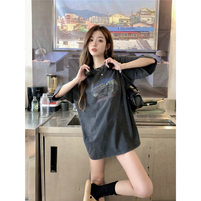 特大码300斤美式复古短袖T恤女夏季新款印花水洗做旧宽松上衣