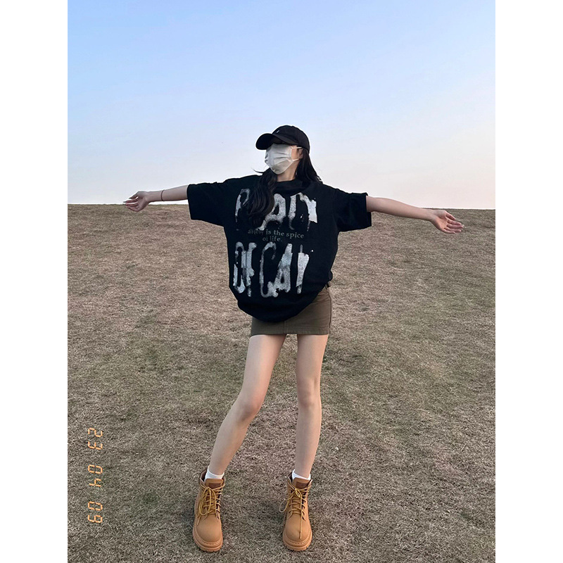 纯棉美式涂鸦字母印花黑色短袖T恤女2025新款夏季宽松大码上衣潮