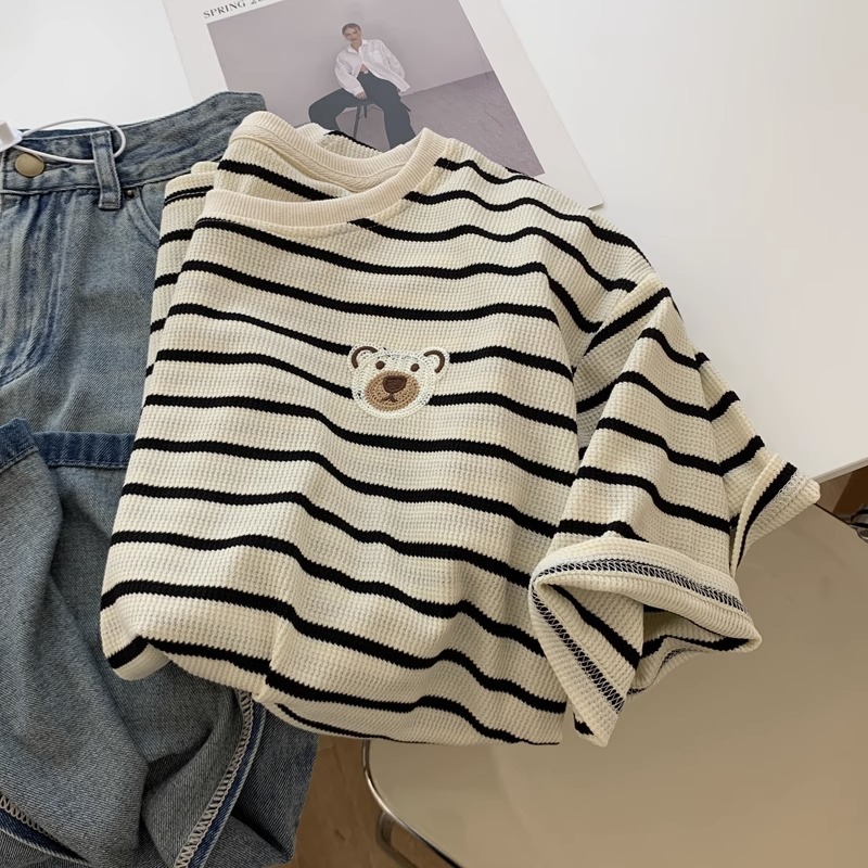 华夫格纯棉条纹短袖T恤女宽松显瘦慵懒风卡通刺绣半袖夏季上衣服