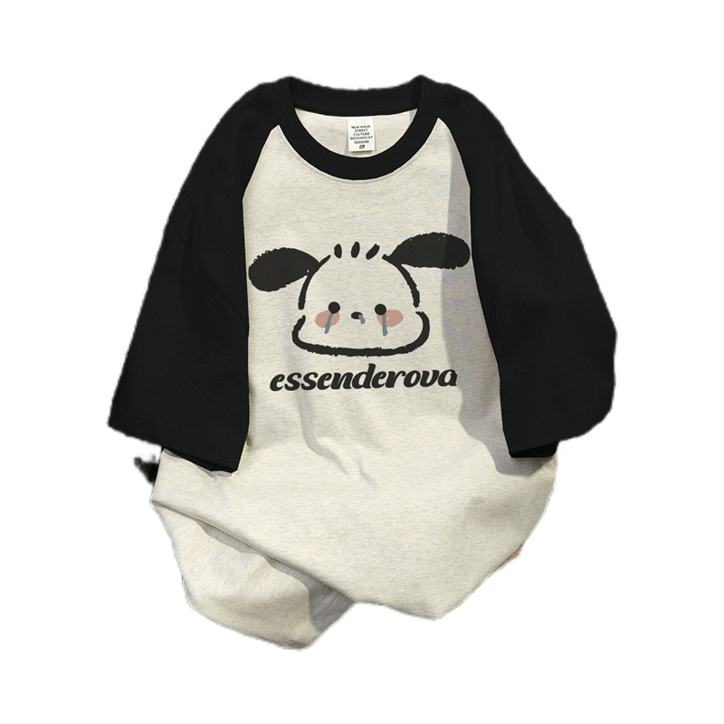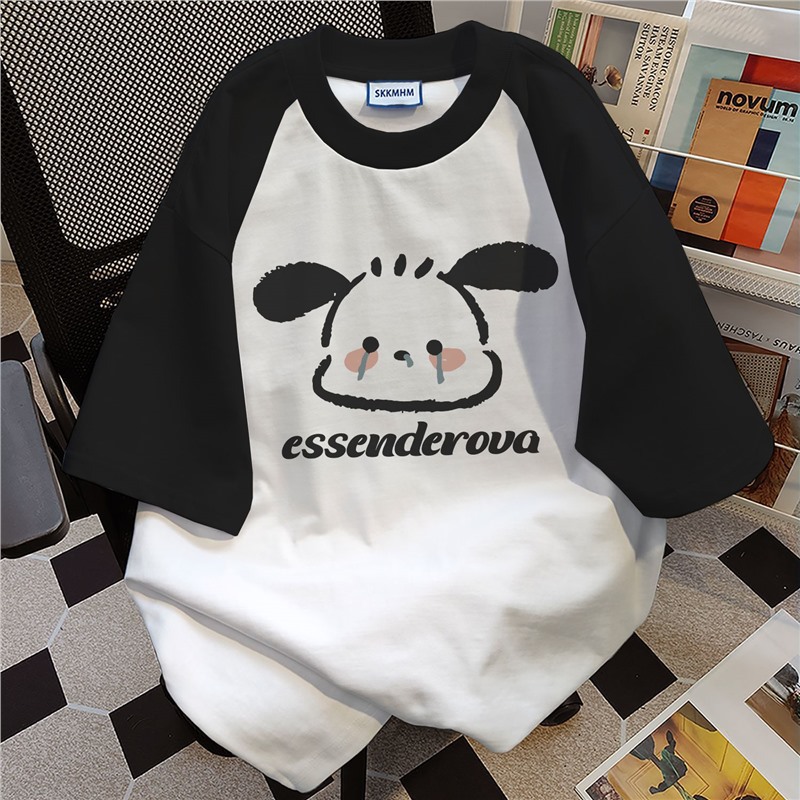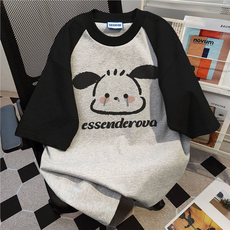 胖mm大码纯棉美式短袖上衣女夏宽松可爱小狗印花拼接圆领300斤t恤