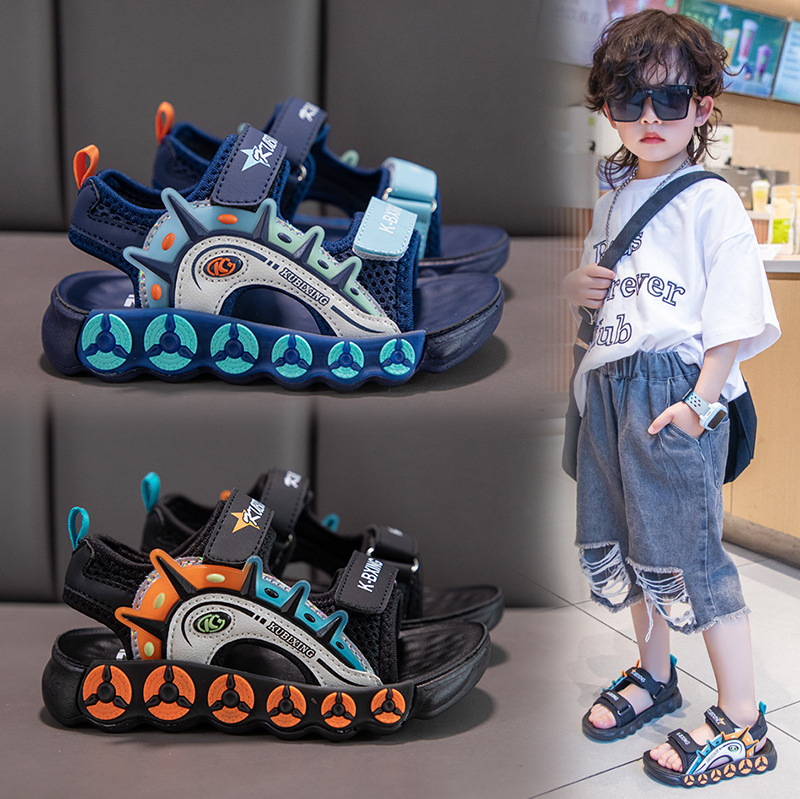 2025款男童凉鞋人造革沙滩鞋魔术贴橡胶透气蓝橘色中性休闲小童鞋