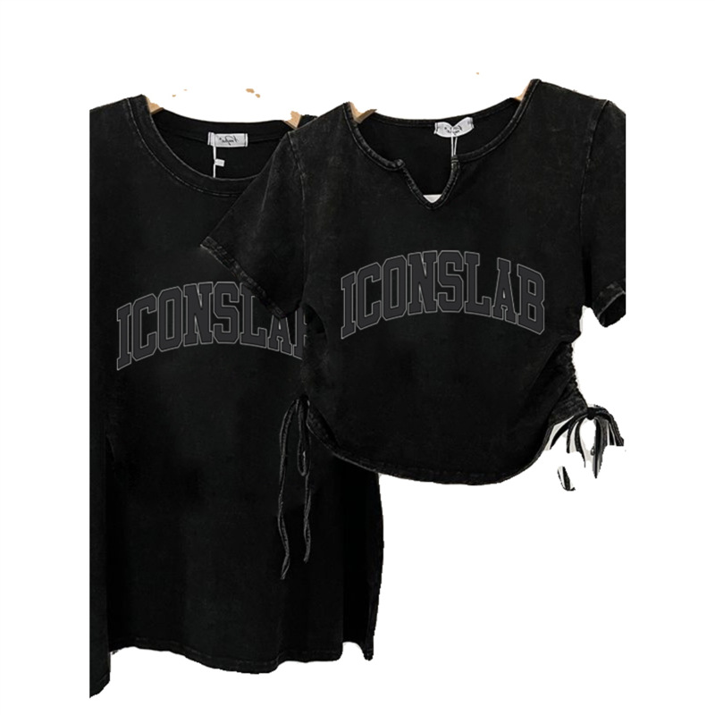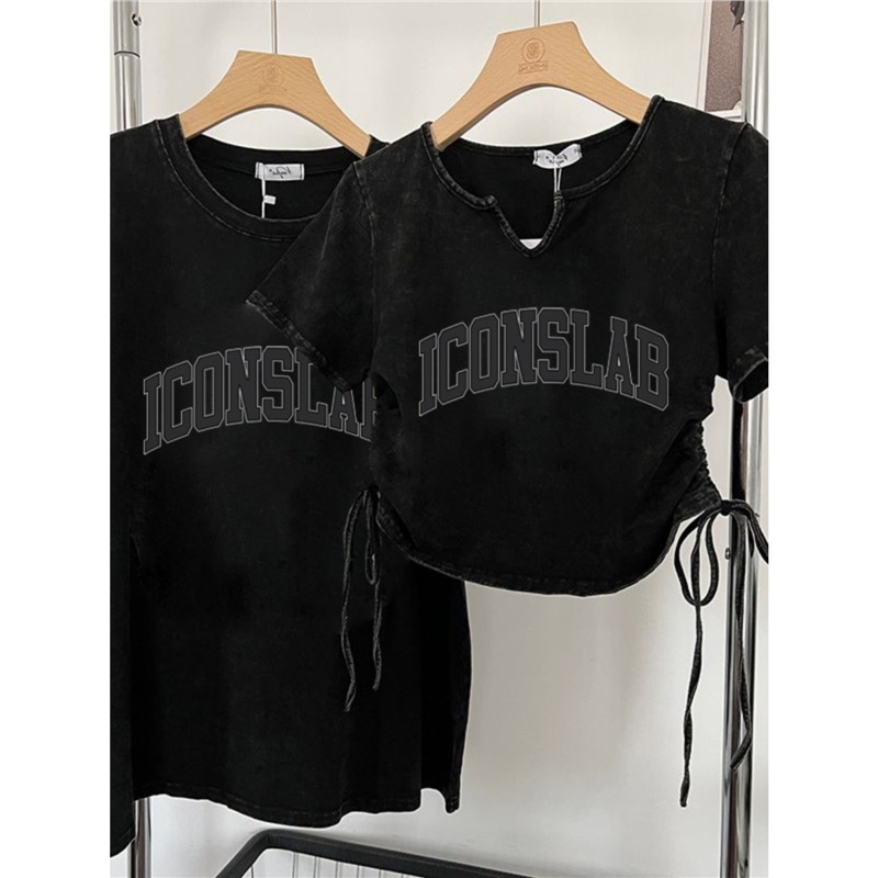 水洗做旧纯棉短袖V领正肩t恤女夏设计感抽绳显瘦甜酷纯欲短款上衣