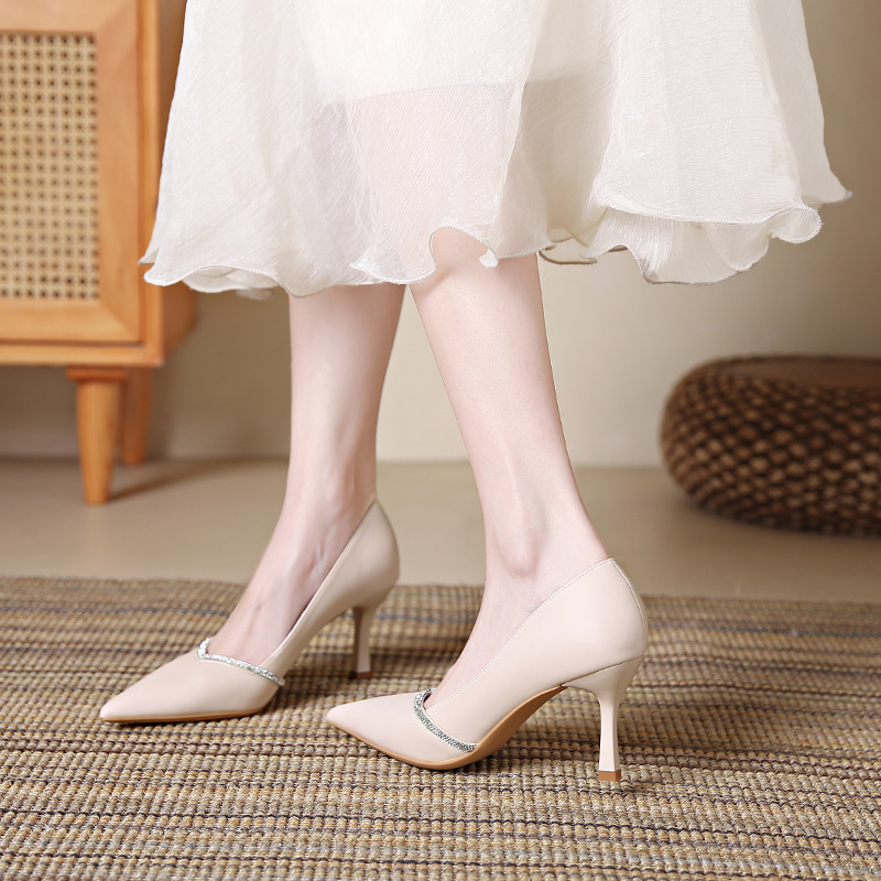 高跟鞋女夏季新款法式尖头浅口细跟套脚水钻气质单鞋女