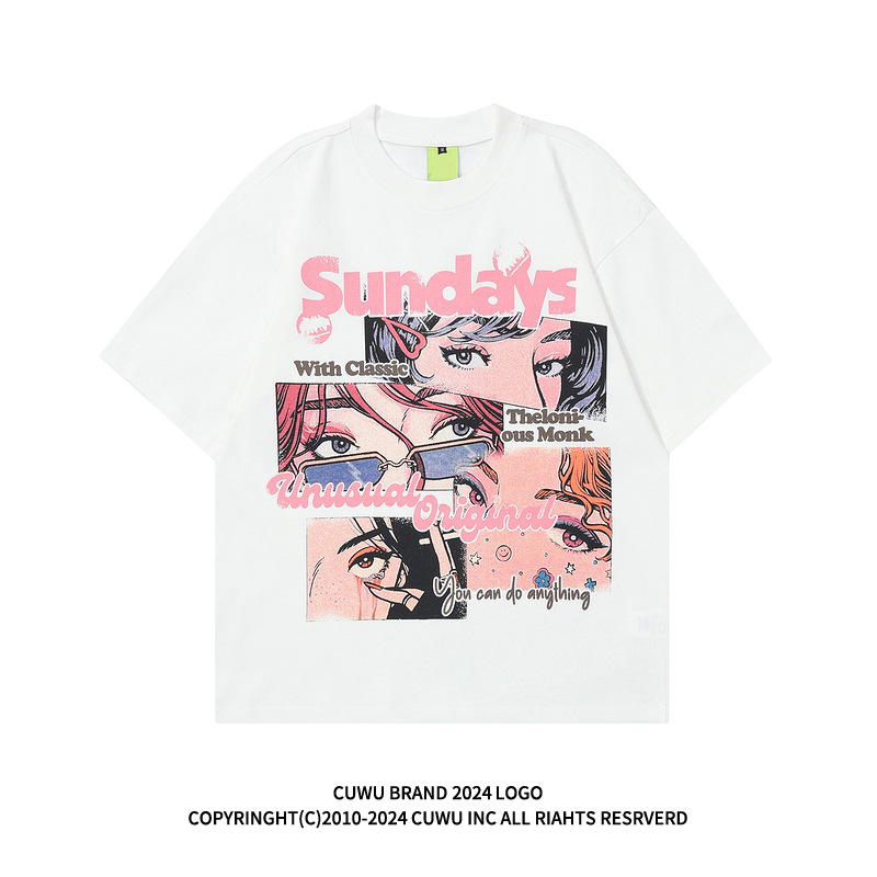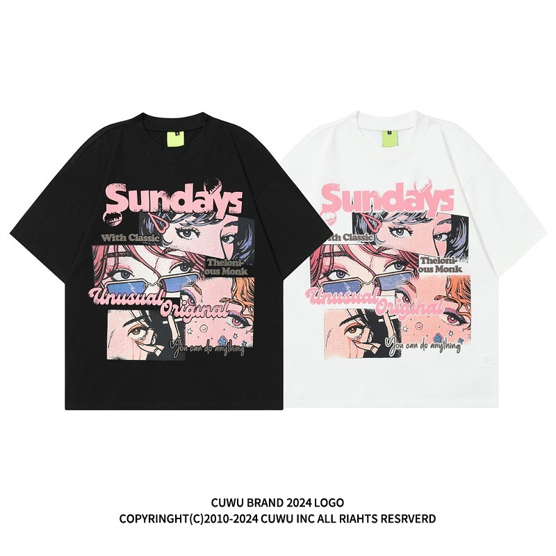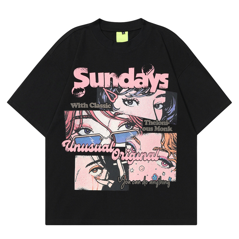 日系复古动漫印花黑色短袖T恤女夏季新款宽松上衣