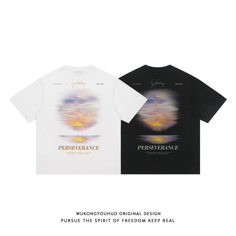 美式复古日落短袖T恤男女夏季宽松情侣半袖