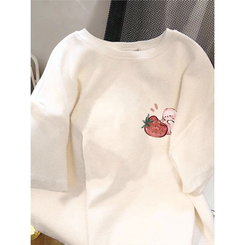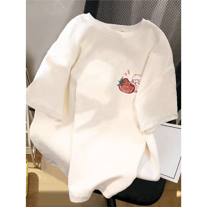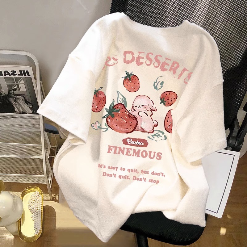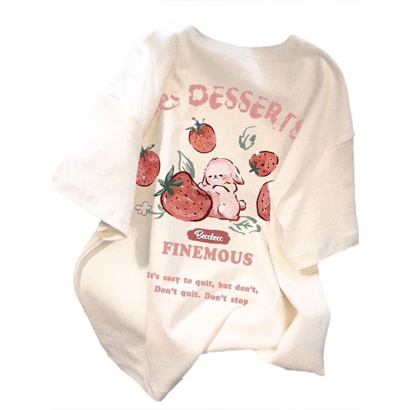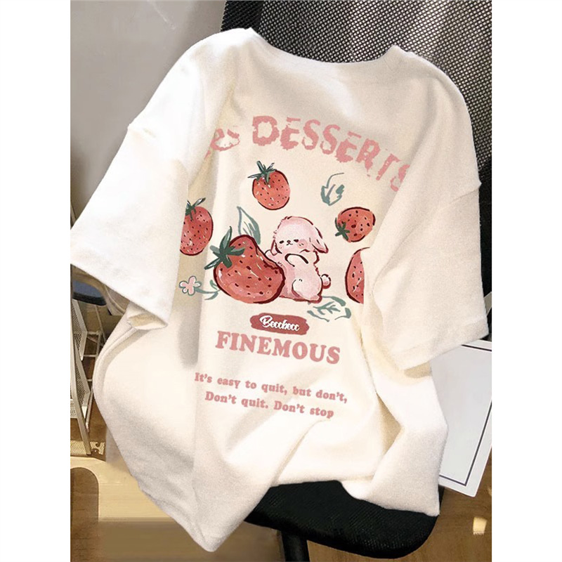 夏季2025新款草莓兔印花纯棉大码t恤女短袖宽松减龄chic百搭上衣