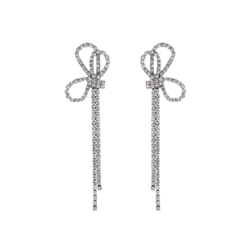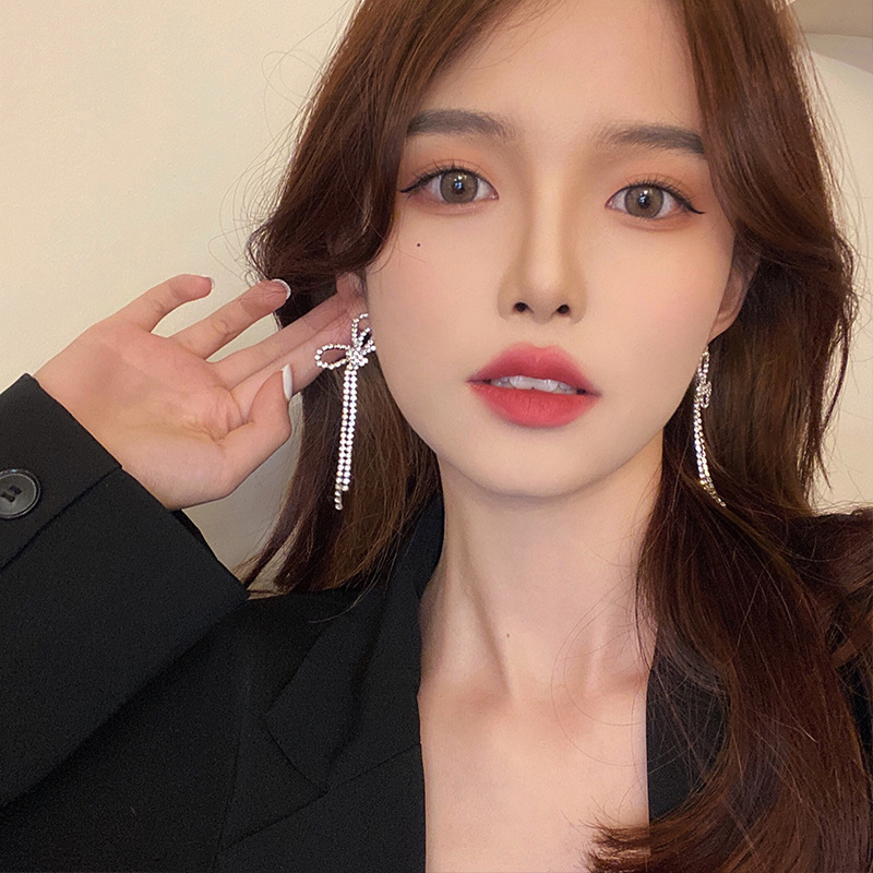 超闪水钻流苏耳钉女网红甜美精致超仙蝴蝶结耳环长款耳坠925银针