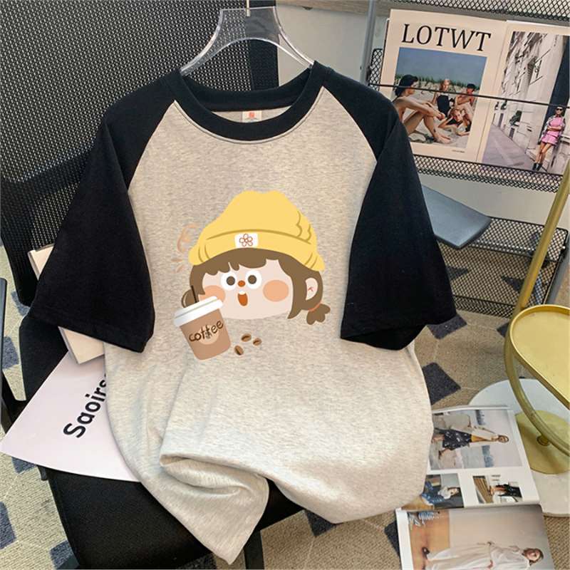 美式复古宽松大码胖mmT恤女春薄款插肩袖纯棉小个子印花上衣ins