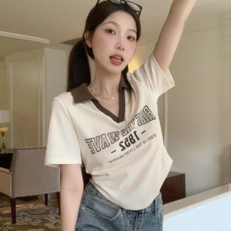 纯棉大码Polo领短袖t恤女夏季美式复古新款微胖显瘦正肩短款上衣