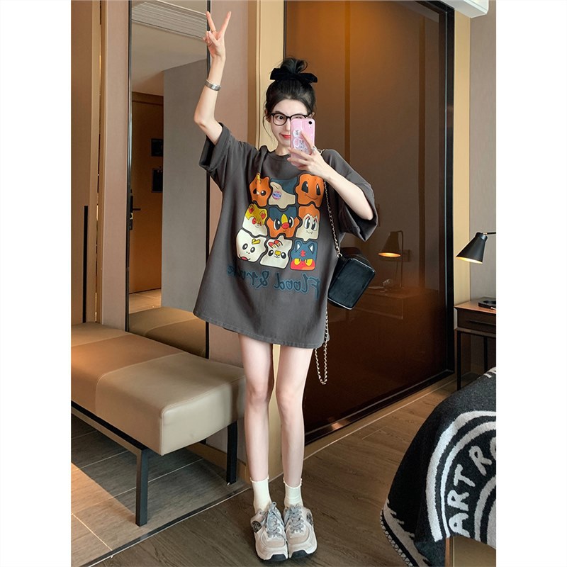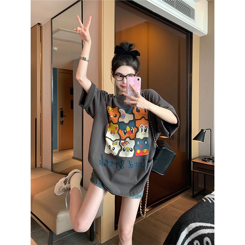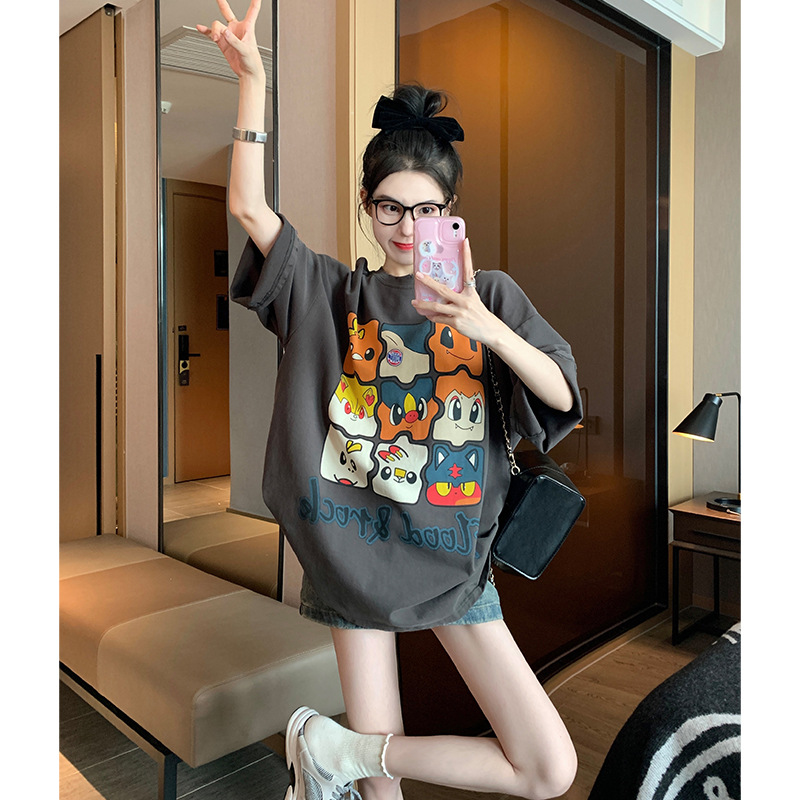 大码美式设计感涂鸦小猫印花短袖T恤纯棉2025夏季学生打底衫上衣