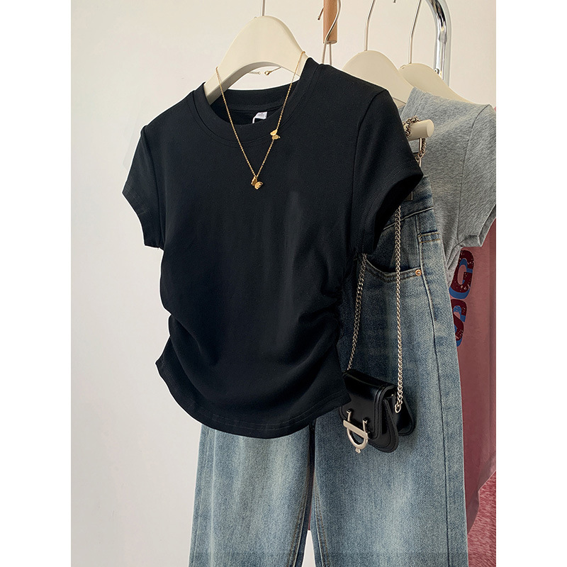纯棉短款纯色短袖t恤女夏季新款设计感正肩体恤修身百搭上衣