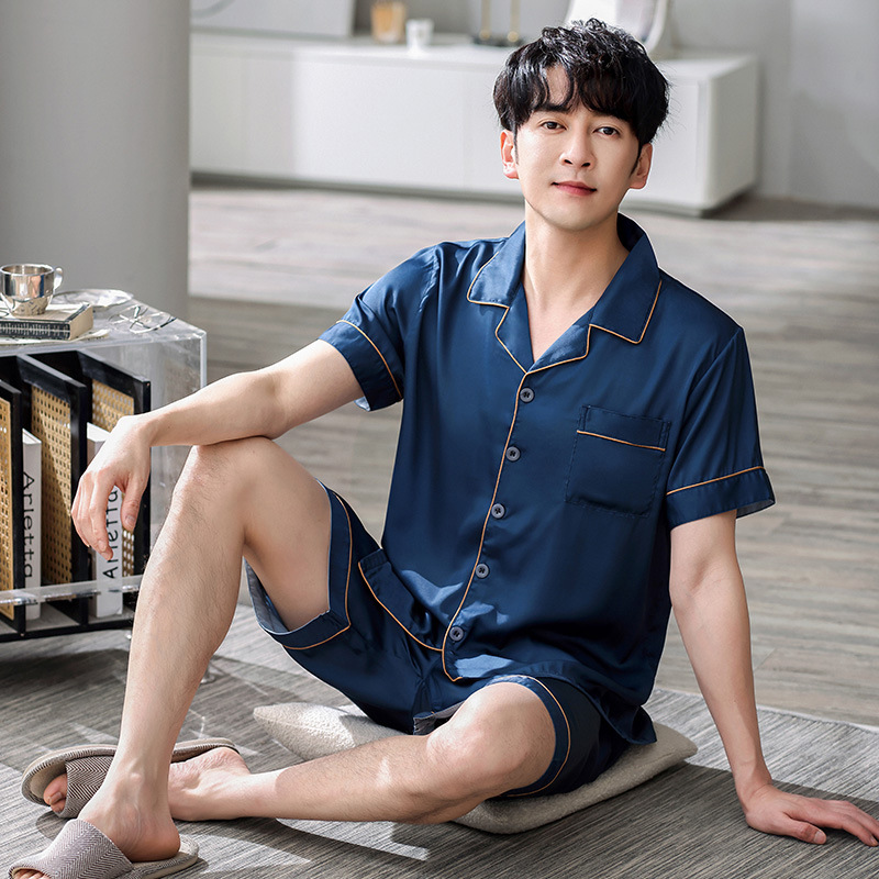春夏短袖长裤真丝睡衣男士开衫纯色花边两件套装高级感家居服