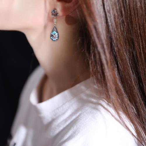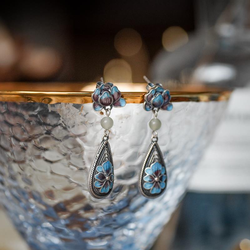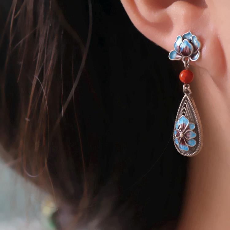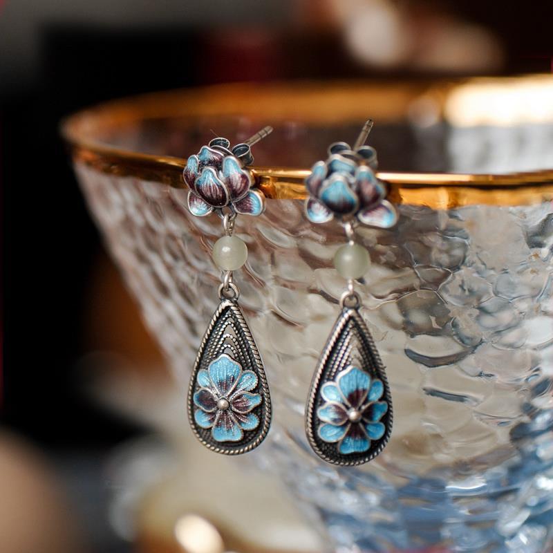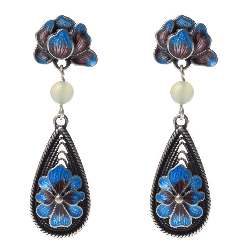 牡丹花烧蓝花丝耳钉镀白金色饰品民族风珐琅彩复古耳环女耳坠礼物