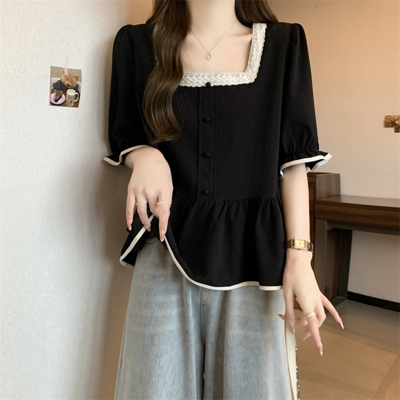 大码女装遮肚子设计感方领正肩短袖衬衫女胖MM宽松显瘦娃娃衫上衣