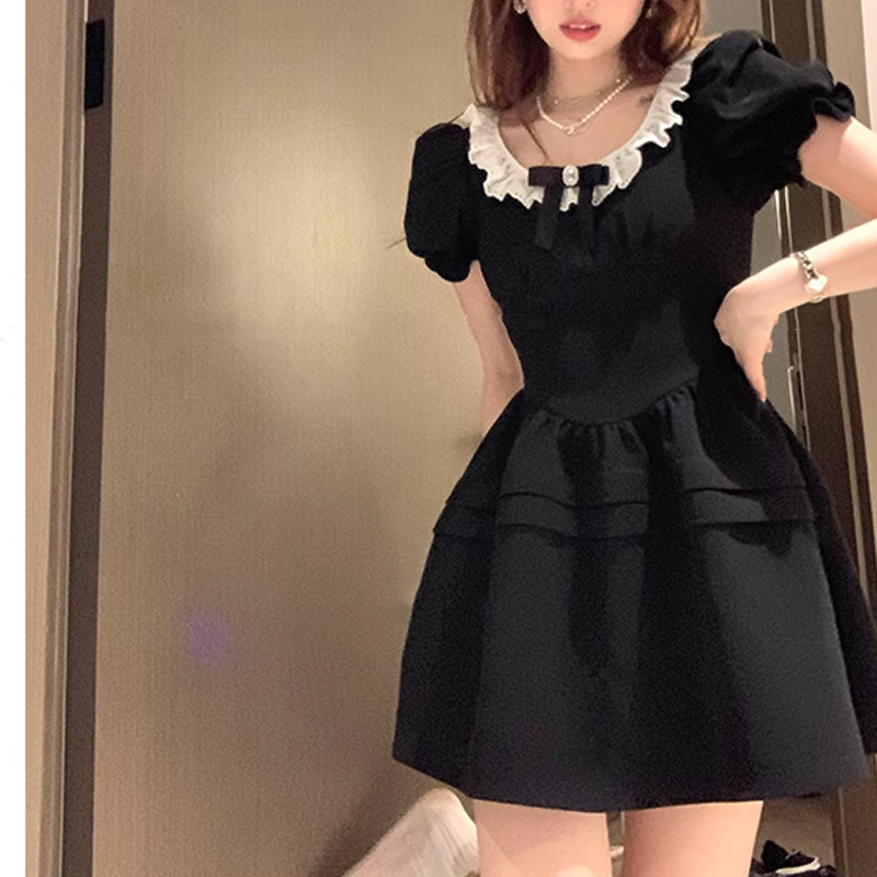 香榭丽舍 千金感小黑裙 夏季新款方领蝴蝶结泡泡袖连衣裙女