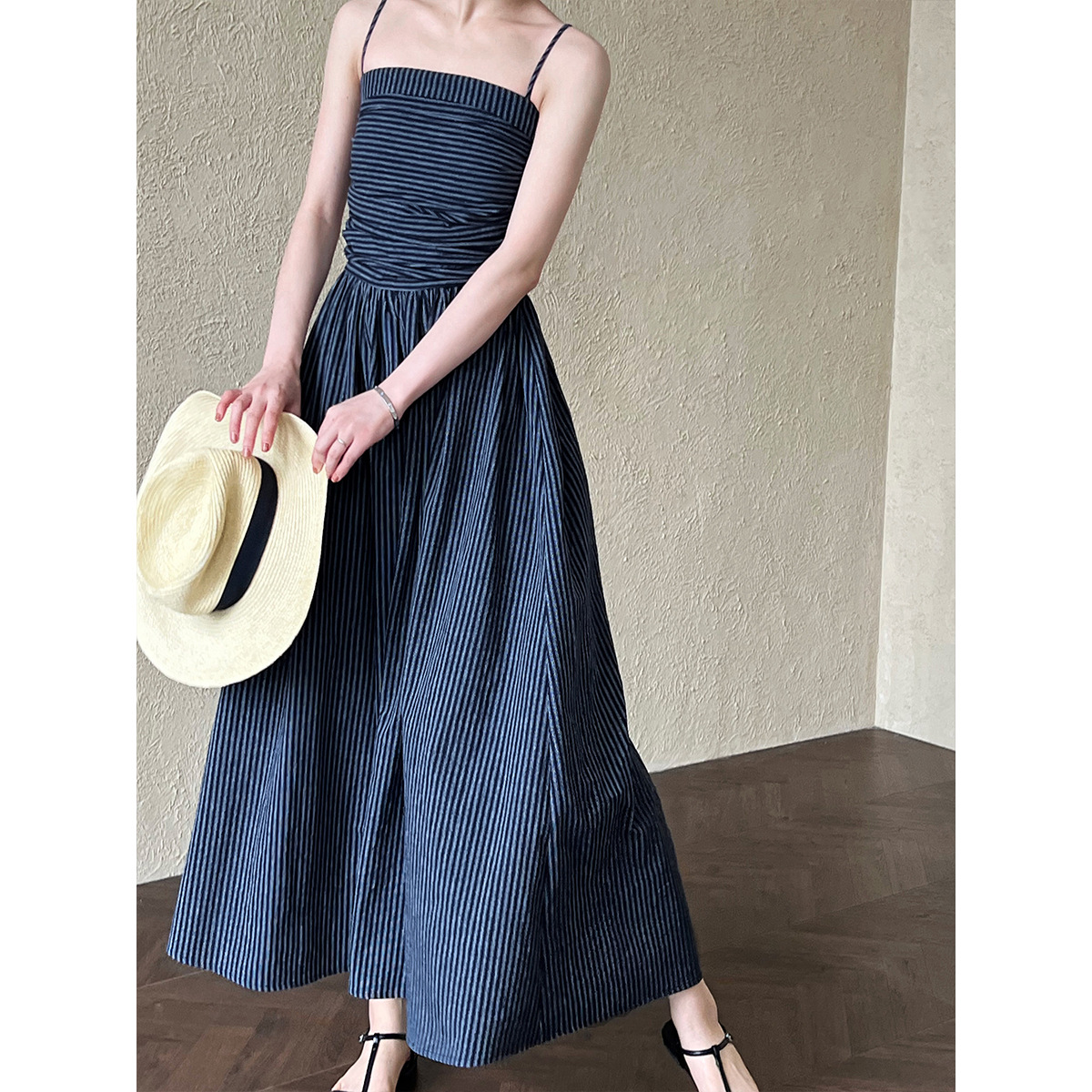 设计感条纹吊带裙无袖连衣裙收腰显瘦A字抹胸长裙女夏季