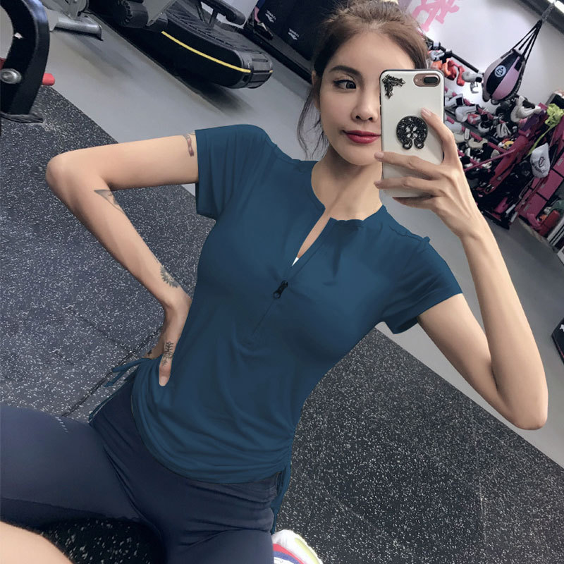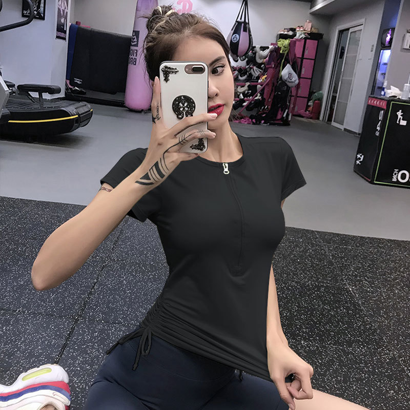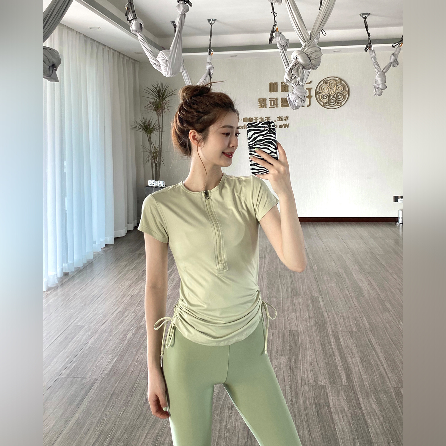 半拉链运动上衣女夏季抽绳短袖T恤衫女专业普拉提瑜伽训练健身服