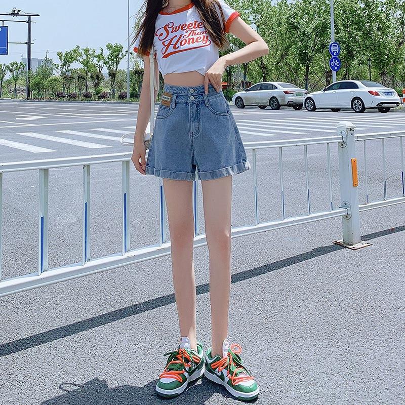 卷边牛仔短裤女小个子高腰双扣牛仔阔腿短裤夏宽松直筒a字热裤潮