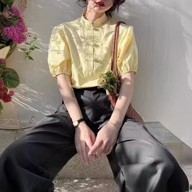 中国风复古盘扣衬衫女夏季衬衣气质立领设计感泡泡袖上衣