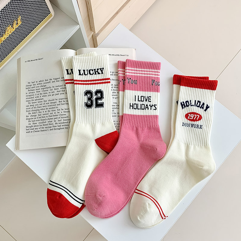 粉色字母少女中筒袜ins潮网红男女外穿纯棉运动袜日系长筒袜