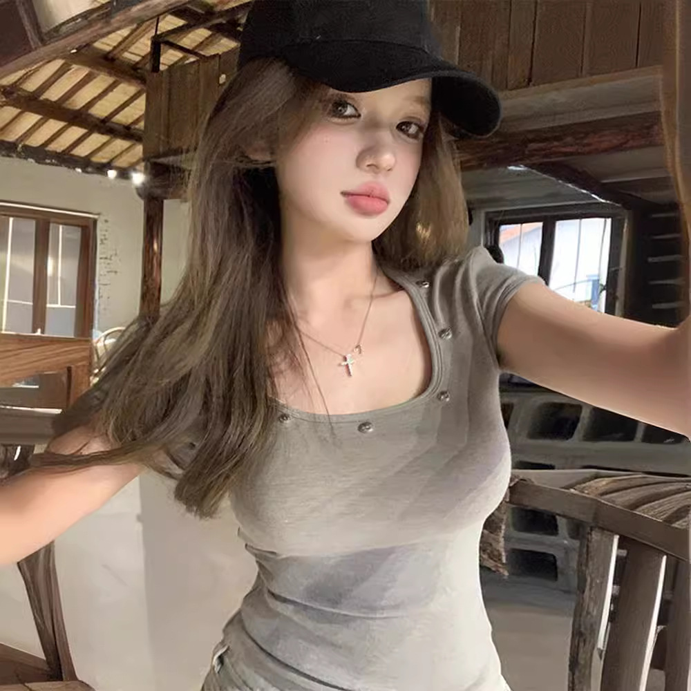 蓝色纽扣装饰u领短袖正肩T恤女夏季设计感基础款辣妹紧身短款上衣