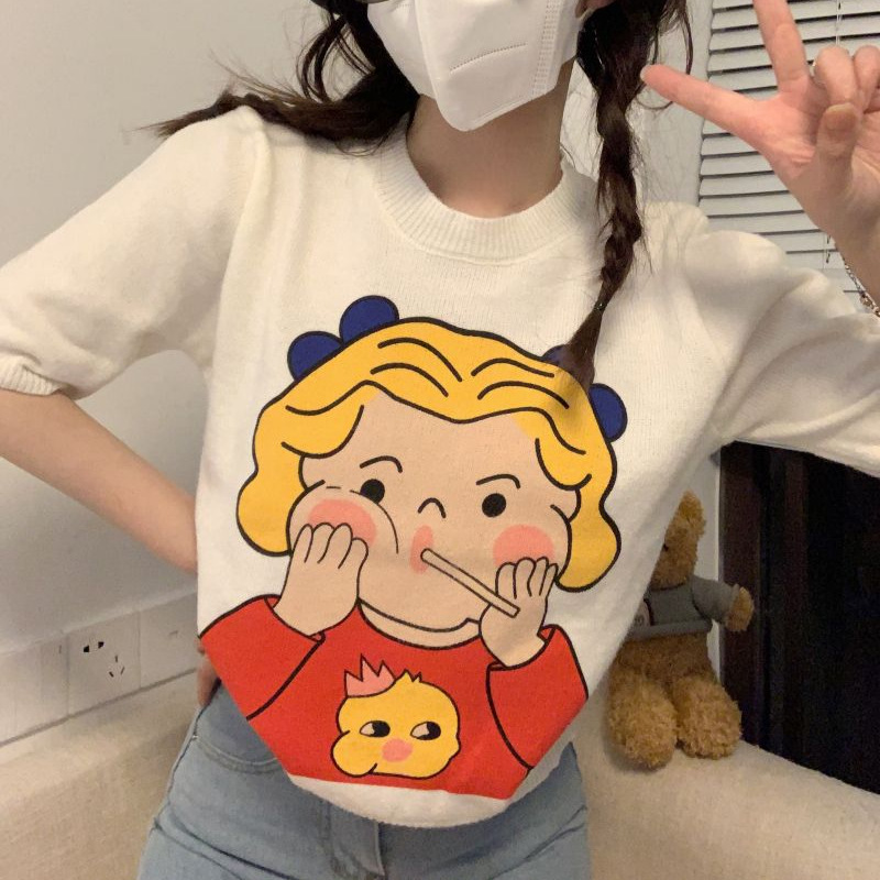 卡通印花针织短袖t恤女夏季新款宽松显瘦韩版半高领打底上衣