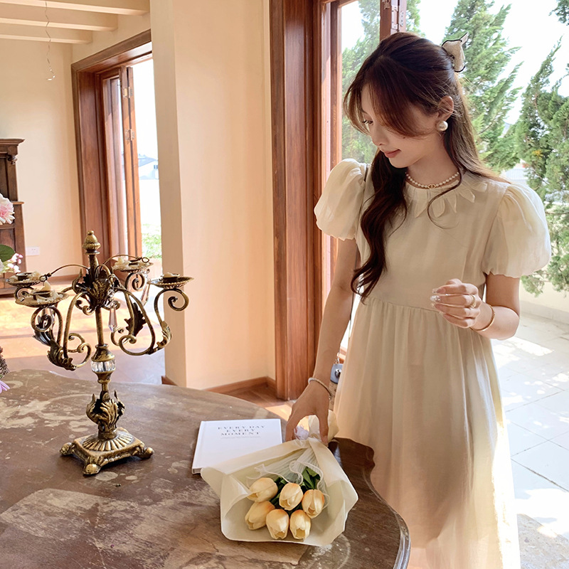 法式轻熟风落肩泡泡短袖高腰压褶A字中长款连衣裙休闲甜美仙女裙