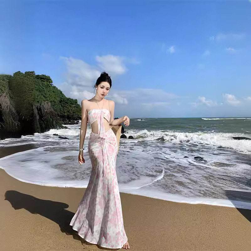 碎花挂脖抹胸吊带连衣裙粉色新款套装女夏二件套度假风长裙子