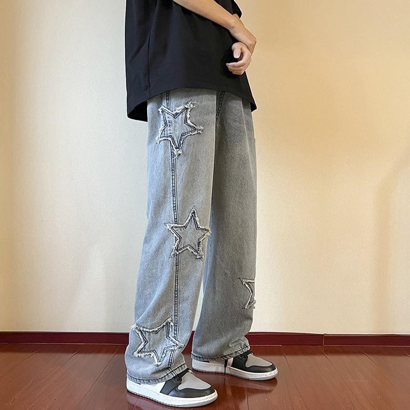 美式高街水洗五角星牛仔裤男士韩版宽松青少年直筒拖地阔腿休闲裤