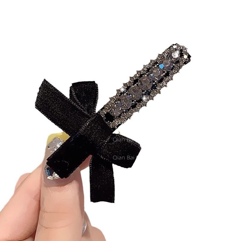 轻奢复古丝绒蝴蝶结发夹小香风灰色水钻高级感刘海夹一字夹边夹女