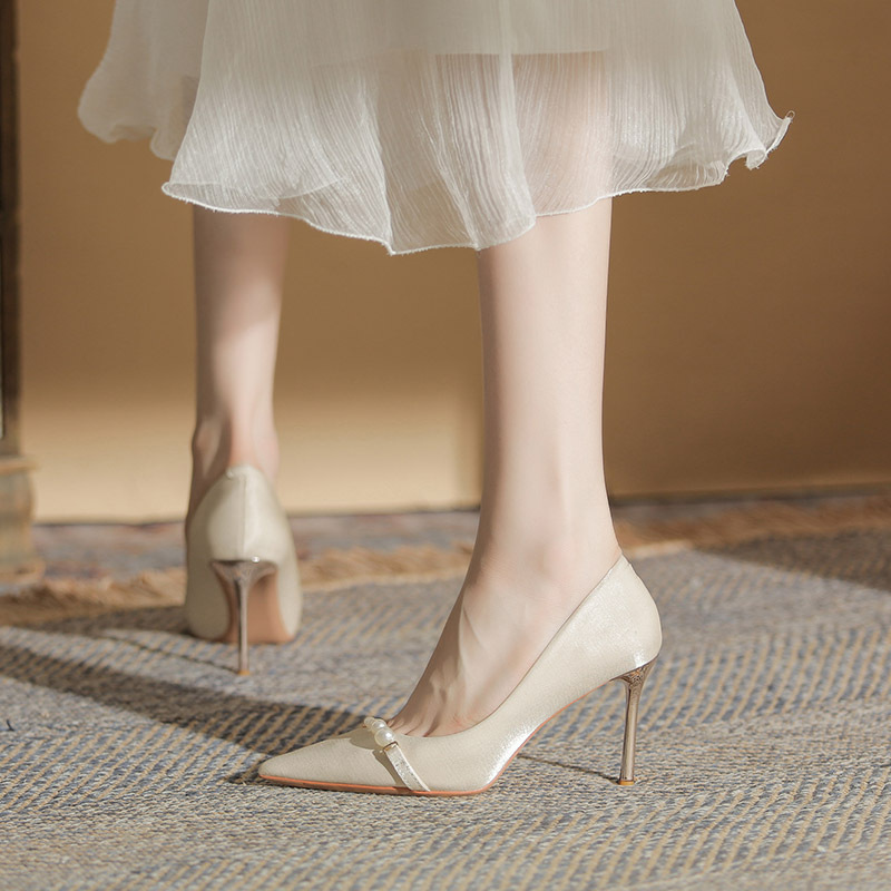 气质珍珠婚鞋法式新娘鞋香槟色气质伴娘高级感细高跟礼服旗袍单鞋