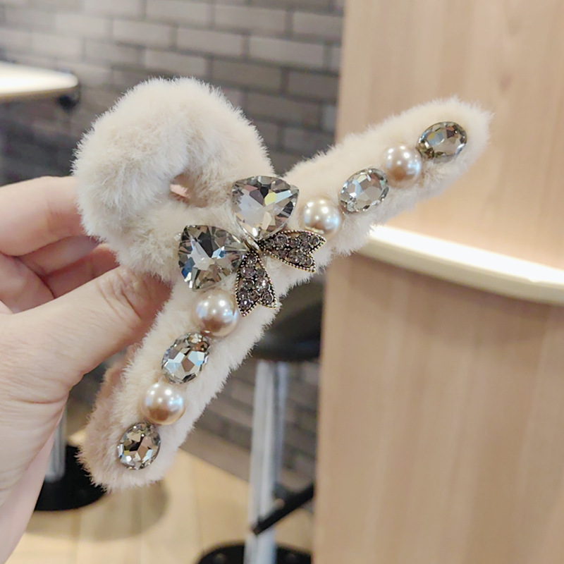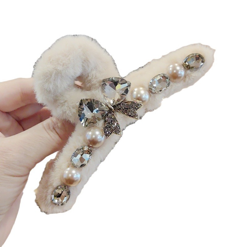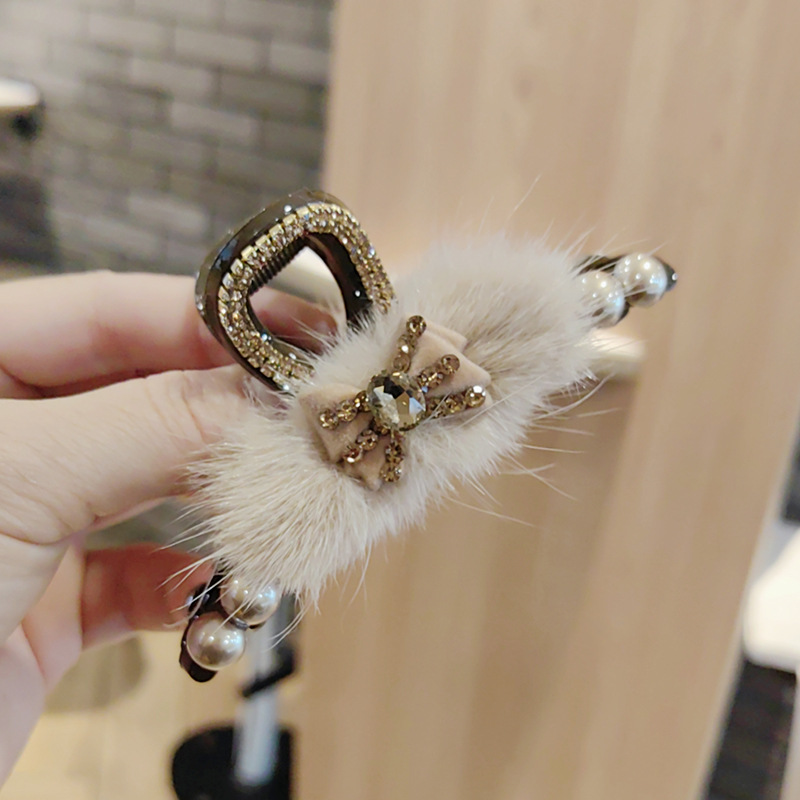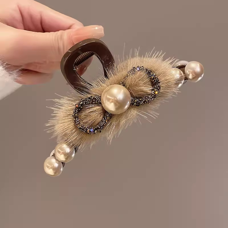 蝴蝶结珍珠毛毛抓夹长14cm