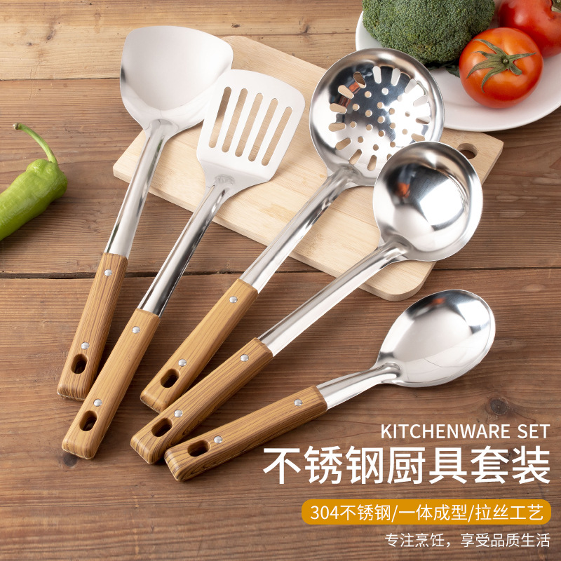 加厚不锈钢家用厨房仿木纹手柄锅铲煎铲饭勺漏勺烹饪厨具五件套