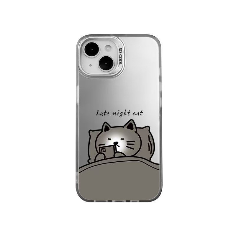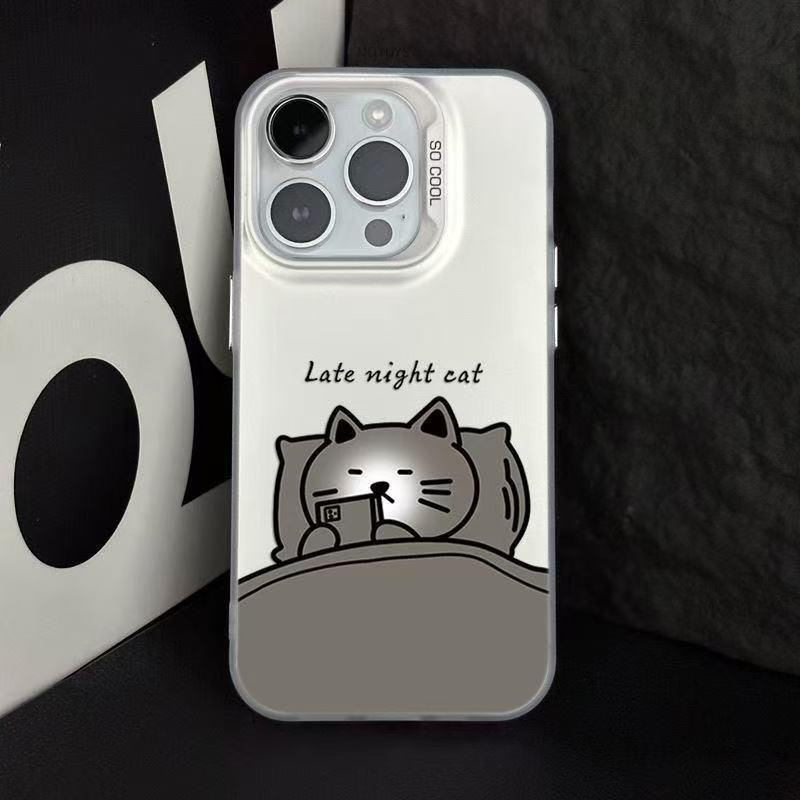 适用苹果16/15/14熬夜猫彩银手机壳防摔硬磨砂L