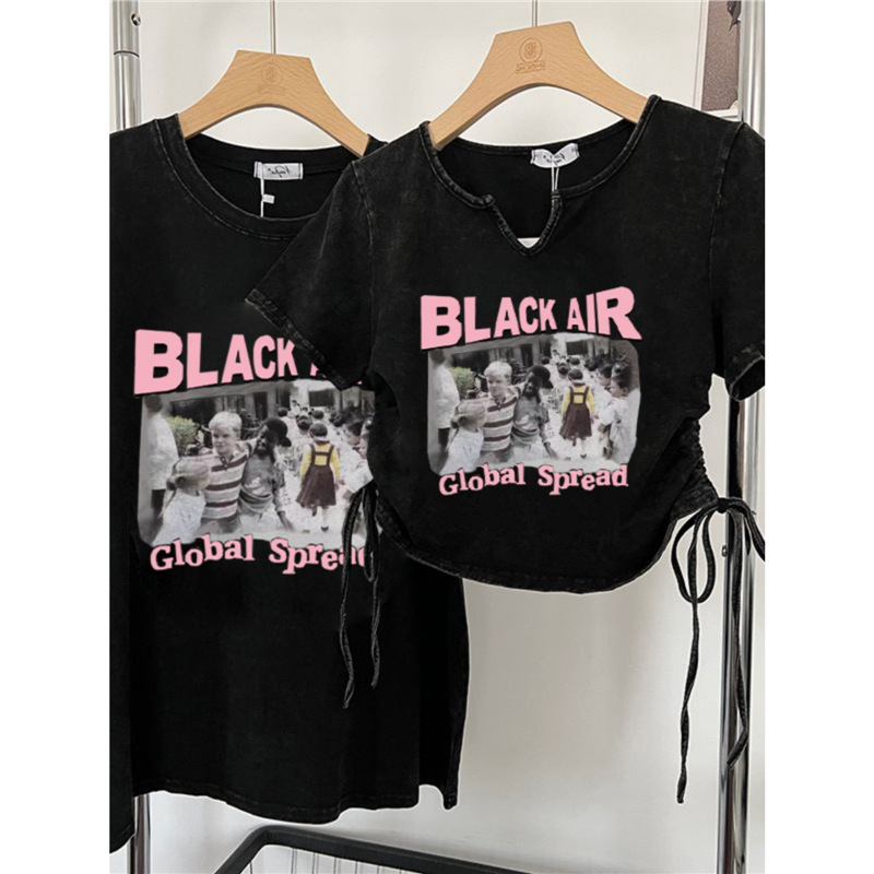 水洗做旧纯棉短袖短款正肩t恤女夏V领美式小众辣妹小个子上衣