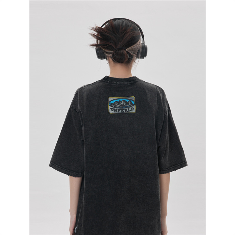 黑色水洗做旧短袖t恤女夏季设计感小众半袖宽松情侣上衣新款