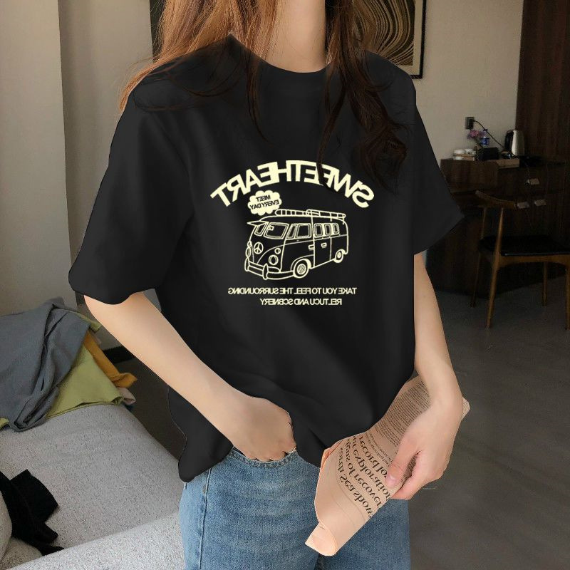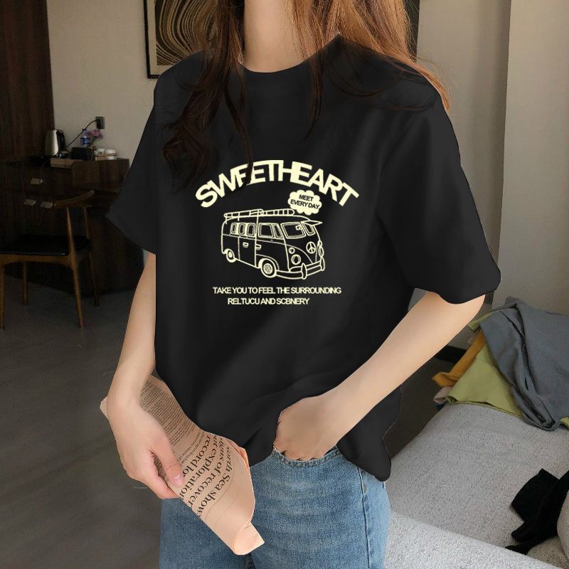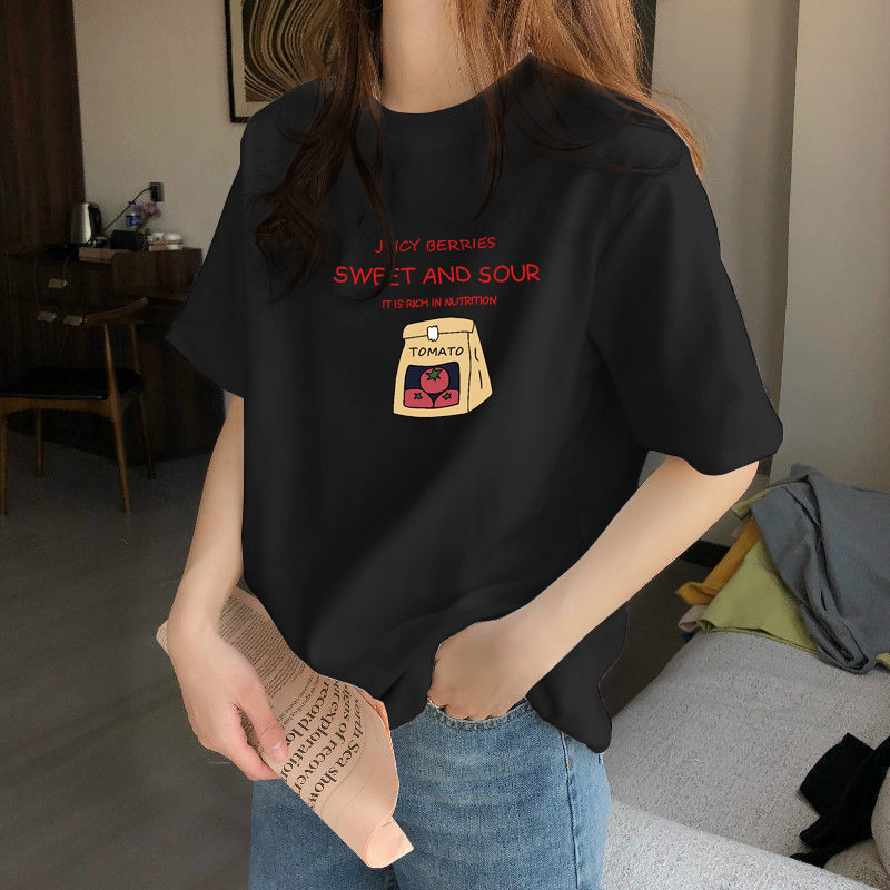正肩短袖T恤女春季设计感小众宽松百搭印花半袖体恤上衣ins潮
