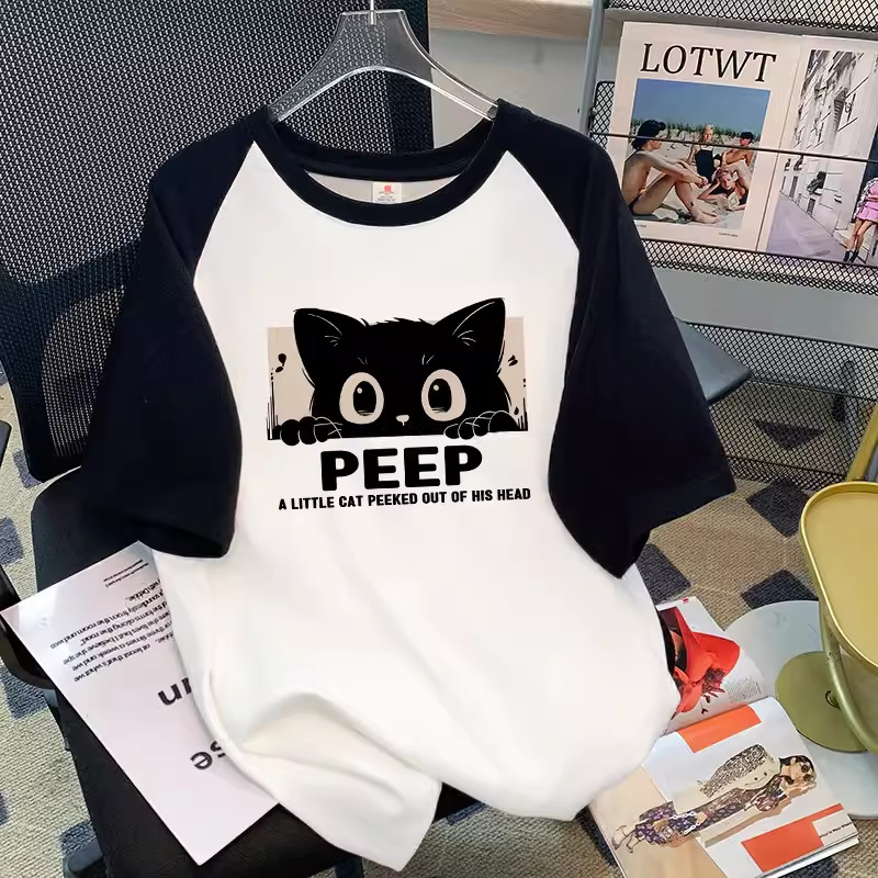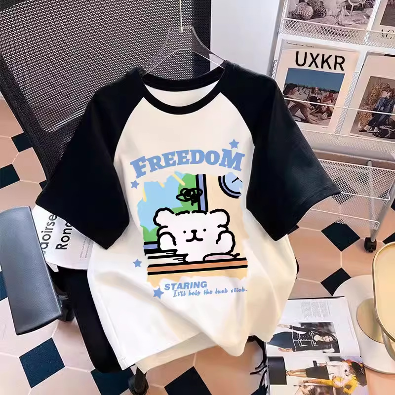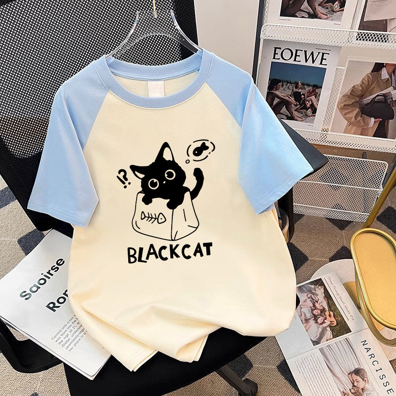 学生夏季卡通黑白撞色插肩袖短袖t恤女2025新款宽松洋气时尚上衣