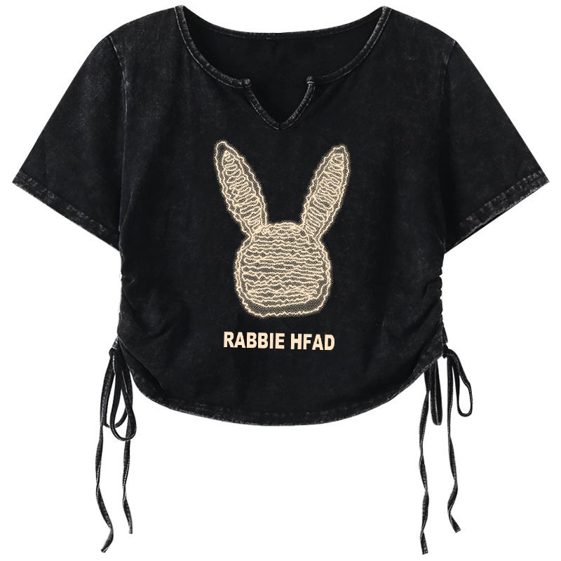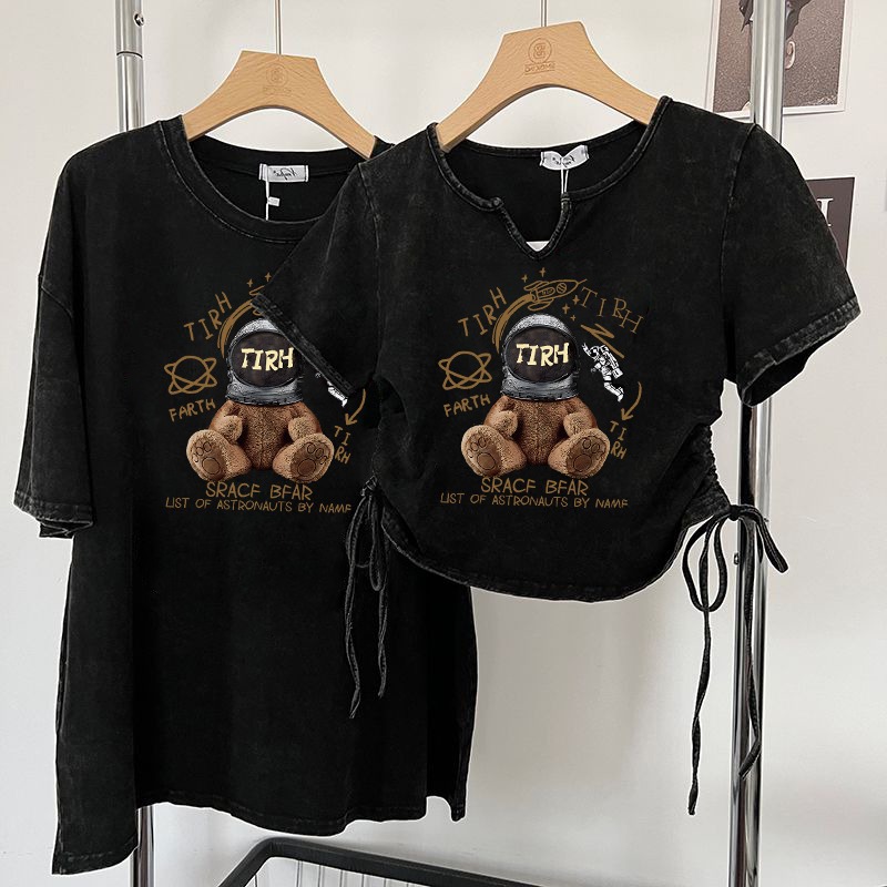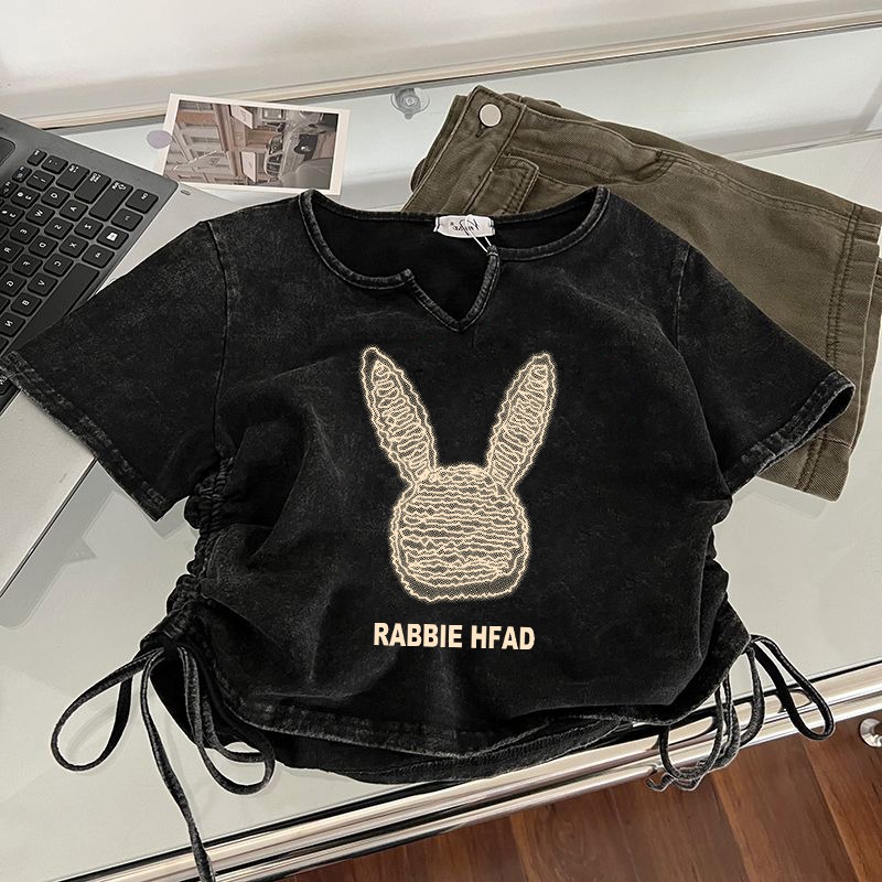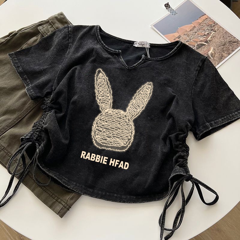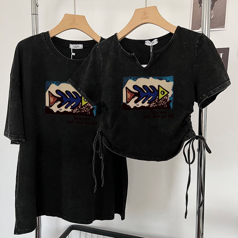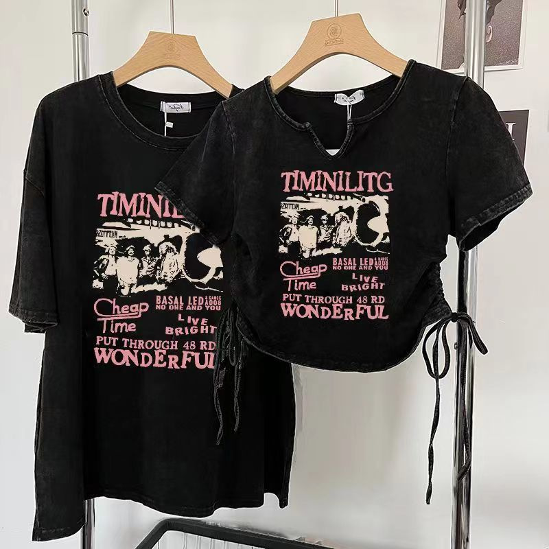 美式复古洗水做旧T恤女设计感小众抽绳超火辣妹上衣情侣装短袖潮